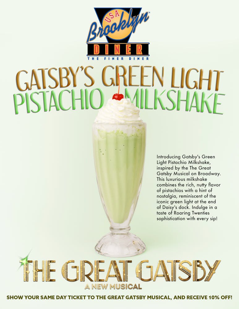 Special Offer: Enjoy 10% off your milkshake purchase when you present your same-day ticket to The Great Gatsby musical! This offer is valid at both Brooklyn Diner locations.