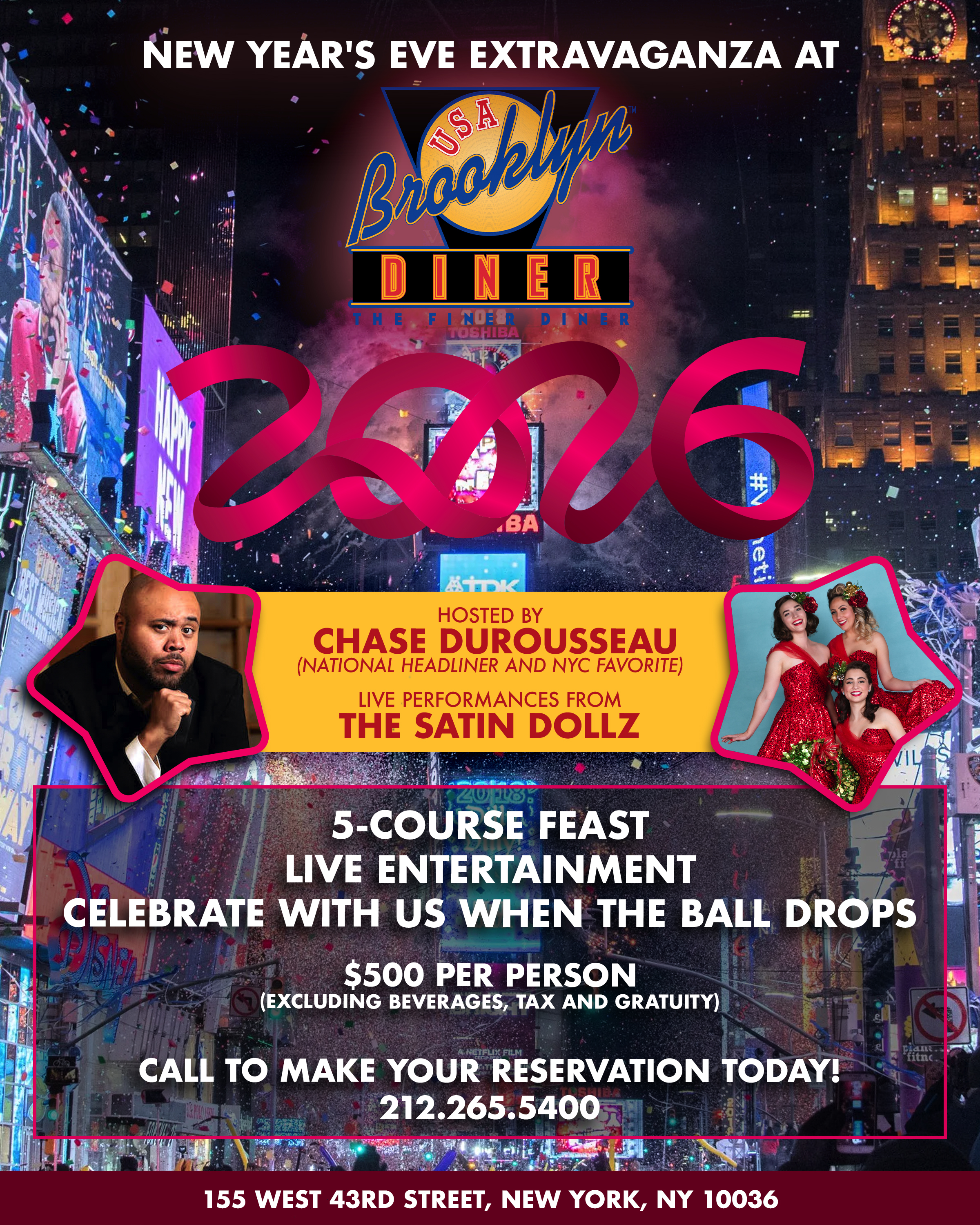 Join us for an unforgettable evening where the magic of Times Square comes alive right outside our doors. Secure your spot today for a night of laughter, music, and the iconic New Year's Eve ball drop at the Brooklyn Diner Times Square!